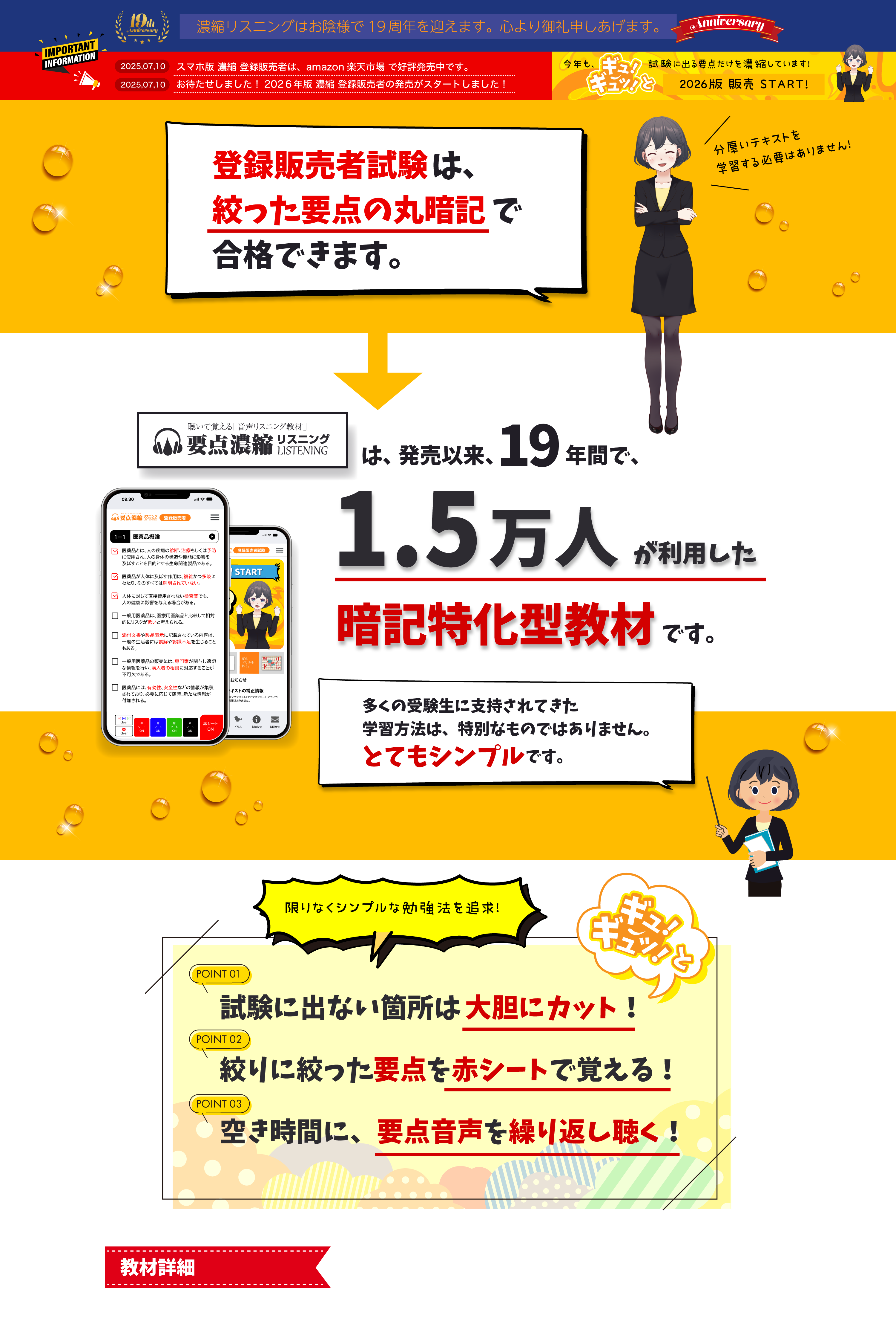 家事や仕事に追われる毎日で、なかなか集中して勉強する時間がなく焦っていましたが、要点濃縮リスニングを毎日通勤時間に聴くことで、時間を有効活用することができ合格できました!はじめはCDの内容を理解できませんでしたが、いつの間にか、過去問題や模擬試験をやったときに正解を導き出せるようになりました。知らず知らず、頭に残ってくれたようです。ありがとうございます!
