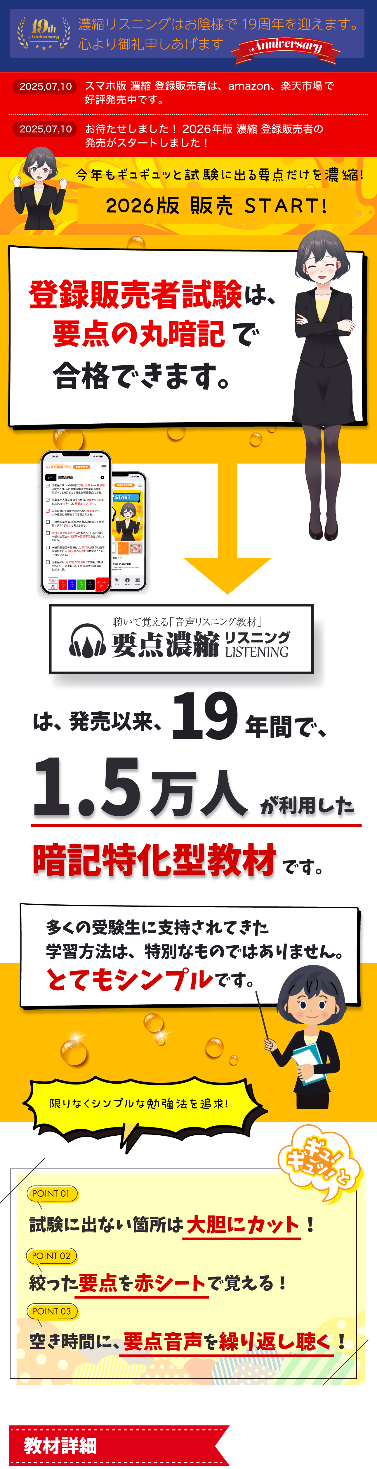 通勤中の車の中や短時間で効率良く学習し合格出来ました!参考書などの本を読むだけでは頭に入らず、長時間の勉強では集中力が欠けるし、大変困っていましたが「要点濃縮リスニング」があって助かりました。通勤中の車の中や短時間で効率良く学習でき、結果合格することが出来ました!何回も繰り返し聴き、要点ドリルを実施するこの学習方法は工夫があり私にピッタリでした。